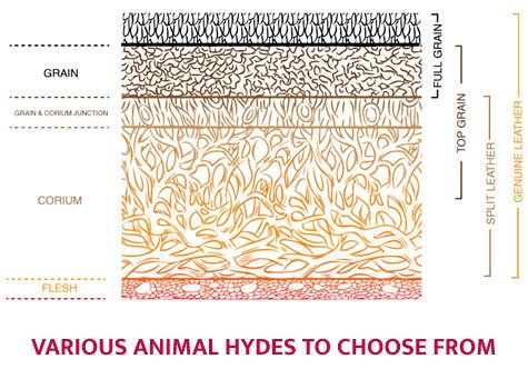 The hide can come from several different places, resulting in different qualities and uses. Top grain is the highest quality and lasts the longest, followed by split leather.